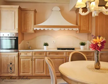 Wohnzimmer und Schlafzimmer voll möbliert, begehbarer Kleiderschrank im Schlafzimmer, Schlafzimmer mit einem Einzelbett (ausziehbare Teile), ein weiteres Zimmer mit einem Einzelbett (Etagenbett oder Doppelbett auf Anfrage), große Küche in Eiche mit 4 Kochplatten und Backofen, Geschirrspüler, Schneidemaschine und Mikrowelle, Badezimmer mit Badewanne mit Jacuzzi, Badezimmer mit großer Dusche (beide Badezimmer mit Marmorboden mit Holzeinlagen und venezianischem Stuck verziert), Holzböden, Holzbalken in gebleichtem Holz, Marmor-Kamin ‘800-Stil, große Wohnterrasse mit schöner Aussicht.