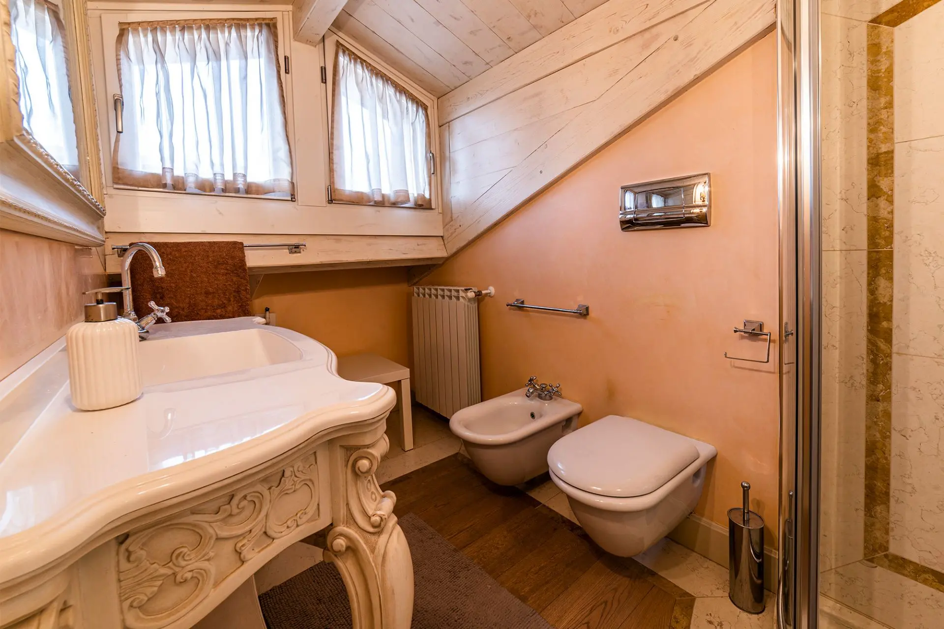 This is the real pride of the whole residence. The attic is finely decorated with tailor-made furniture to exploit the space at its best: it is a real luxury treat. The two big terraces (accessible from the living room and the main bedroom) will offer breathtaking views over beautiful Salò and outstanding Lake Garda. An exclusive lift can be used to reach the flat.